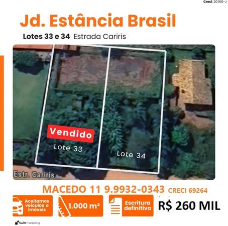 Dimensão e valor: 1.000m² R$ 260.000,00.